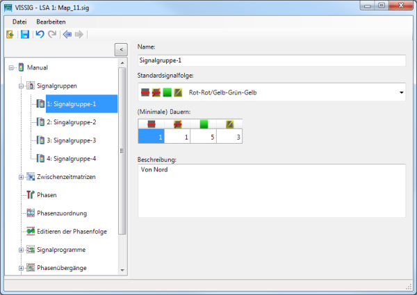 Sie können die Signalbildfolge und die zu dieser Signalbildfolge gehörigen minimalen Dauern ändern. Bei Signalbildern, die in der Signalbildfolge eine variable Dauer haben, wird der eingetragene Wert als Mindestdauer interpretiert, bei den restlichen Signalbildern wird der eingetragene Wert als Dauer interpretiert. Damit lassen sich beispielsweise 2 Sekunden Rot-Gelb, 5 Sekunden Gelb bei 70 km/h zulässiger Geschwindigkeit (in Deutschland) oder 15 Sekunden Mindestfreigabedauer für einen stark belasteten Geradeausstrom versorgen.