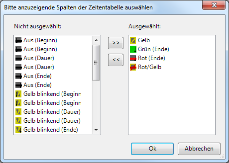 Nur in signalgruppenbasierten Signalprogrammen: Das Fenster Bitte anzuzeigende Spalten der Zeitentabelle auswählen öffnet sich. Die Einstellungen werden in der Registry Ihres Computers gespeichert und können sich abhängig vom Benutzer ändern.