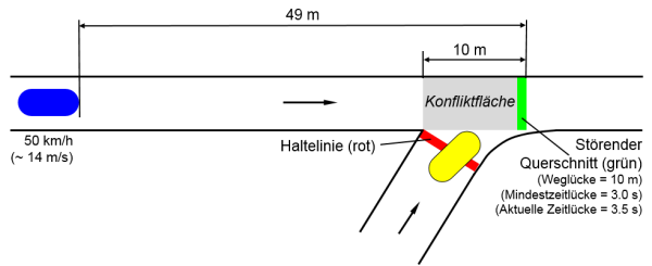 In der folgenden Abbildung fährt das blaue Fahrzeug links auf der Hauptstraße mit 50 km/h (etwa 14 m/s) und befindet sich 49 m stromaufwärts des störenden Querschnitts. Die aktuelle Zeitlücke beträgt 49 m / 14 m/s = 3.5 s. Da die Mindestzeitlücke 3.0 s beträgt, kann das gelbe Fahrzeug unten aus der Nebenstraße einbiegen: