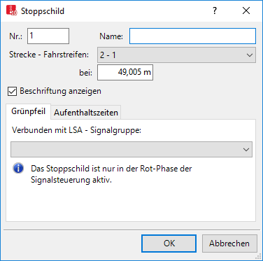 Das Fenster Stoppschild öffnet sich, wenn Sie ein Stoppschild einfügen und das automatische Öffnen des Bearbeiten-Dialogs nach Objekterstellung ausgewählt ist (Rechtsklick-Verhalten und Aktion nach Objekterstellung definieren).