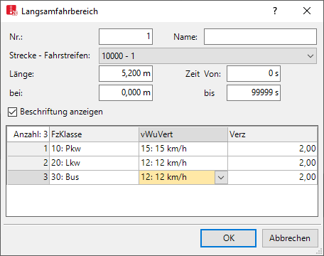 ZeitVon, ZeitBis: Zeitintervall in Simulationssekunden, in dem der Langsamfahrbereich aktiv ist