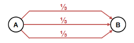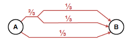 Für jede Quelle-Ziel-Beziehung wird die gesamte Verkehrsnachfrage auf alle verfügbaren Wege verteilt. Die Verteilung orientiert sich dabei an den generalisierten Kosten der Wege, die aus den gemessenen Größen und den eingestellten Gewichtungskoeffizienten berechnet werden. Ein Weg besteht aus einer Abfolge von Kanten. Zwei Wege sind verschieden, wenn ihre Folge von Kanten nicht genau übereinstimmt. Dies gilt auch, wenn sich die Wege nur in einem kleinen Teilstück unterscheiden. In so einem Fall hätten bei der Verteilung der Verkehrsmenge beide Wege ungefähr das gleiche Gewicht. Dies würde insgesamt zu einer verzerrten Verteilung führen. Dieses Problem taucht bei allen Umlegungsaufgaben auf und wird mit Roter-Bus-Blauer-Bus-Paradoxon bezeichnet. Dies zeigen die folgenden Abbildungen: