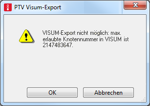 Falls das Vissim-Netz Knoten enthält, deren Nummern größer sind als die maximal erlaubte Visum-Knotennummer 2 147 483 647, kann die Umlegung nicht berechnet werden. Das Fenster PTV Visum Export öffnet sich.