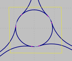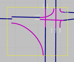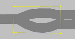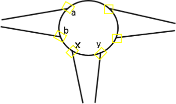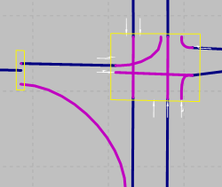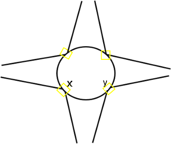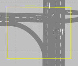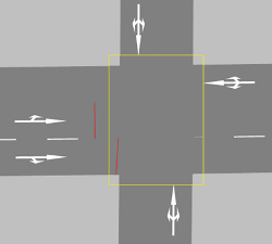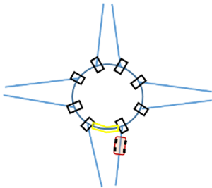 - Falsch modelliert: Die Modellierung im rechten Bild ermöglicht dem Fahrzeug nicht, die relevante Meso-Kante wahrzunehmen. Für die Konflikte im Meso-Netzknoten, beispielsweise für die Einfahrt des Fahrzeugs auf die Kreisfahrbahn, kann das Fahrzeug nur nicht relevante Meso-Kanten wahrnehmen (die drei gelb gekennzeichneten Meso-Kanten, die links, oben und rechts in den Meso-Netzknoten hineinführen). Das Fahrzeug kann jedoch nicht die relevante Kante wie im Bild links wahrnehmen. Damit kann das Fahrzeug keine korrekte Meso-Grenzzeitlücke berücksichtigen. Das Fahrzeug hält vor dem Meso-Netzknoten an und gewährt für die von rechts, oben und links einfahrenden Fahrzeuge die Vorfahrt, weil es nur deren Meso-Kanten wahrnimmt.