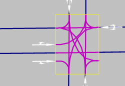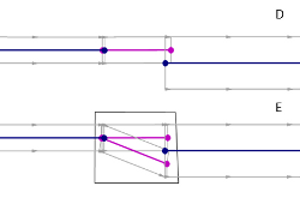 Falscher Ansatz 1: Die Distanz zwischen der Einfahrt und der stromabwärts darauf folgenden Ausfahrt ist nicht ausreichend groß. Dadurch entstehen an jedem Knoten zu viele Konflikte: