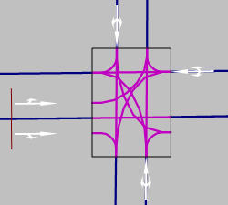 Die beiden folgenden Abbildungen zeigen falsche Ansätze für die Definition von Meso-Netzknoten. Diese Ansätze führen nicht zu einer korrekten Abbildung von Konflikten in der mesoskopischen Simulation: