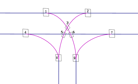 Das folgende Beispiel beschreibt für eine dreiarmige Kreuzung mit neun Abbiegekonflikten die Bedeutung der Reisezeit als Meso-Grenzzeitlücke auf einer Kante. An den neun Abbiegekonflikten sind manuell neun Meso-Netzknoten definiert (1 bis 9):