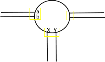 Modellieren Sie Meso-Netzknoten für einen Kreisverkehr abhängig von der Distanz zwischen der Ausfahrt und der nächsten Einfahrt entweder nach Ansatz A oder Ansatz B. Dies zeigen die folgenden Abbildungen und erläutern die Beschreibungen darunter: