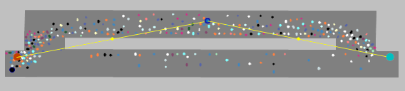 Der Verlauf der Fußgängerroute wird angepasst. Der Zwischenpunkt wird standardmäßig größer und als blauer Kreis angezeigt (in der Abbildung in der Mitte der Fläche oben). Weitere gelbe Punkte werden angezeigt (In der Abbildung links und rechts am unteren Rand der Fläche oben). Mit diesen Punkten können Sie die Fußgängerroute detaillierter modellieren.