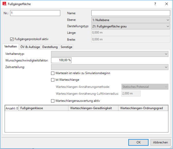 Fußgängerprotokoll aktiv (FgProtAkt): Ist die Option ausgewählt, werden die Fußgänger auf dieser Fläche im Fußgängerprotokoll berücksichtigt (Fußgängerprotokoll in Datei oder Datenbank speichern). |