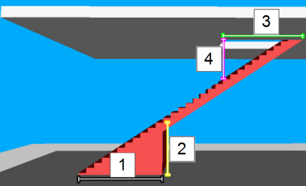 - Die Deckenöffnung am oberen Ende der Treppe ergibt sich entweder aus dem Attribut Länge (3) oder lichte Durchgangshöhe (4).