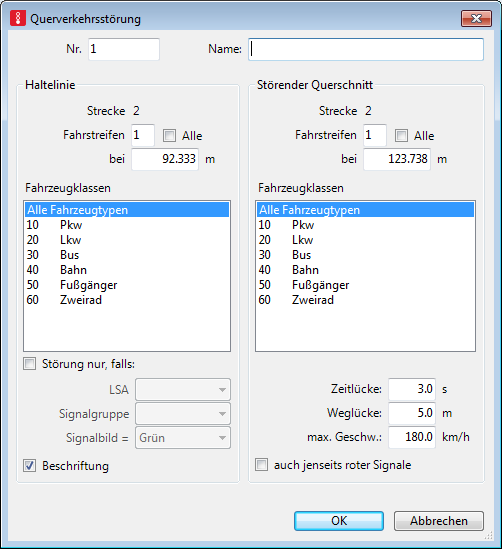 Das Fenster Querverkehrsstörung öffnet sich. In den Bereichen Haltelinie und Störender Querschnitt werden abhängig vom Streckenattribut Ist Fußgängerfläche die Fahrzeugklassen oder Fußgängerklassen angezeigt.