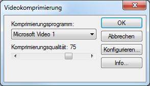 Wenn bisher für die aktuelle Netzdatei noch keine Aufnahme gestartet wurde, öffnet sich das Fenster Videokomprimierung. Eine Datei *.avi benötigt etwa 20 MB/s. Auf Ihrem Computer können standardmäßig mehrere Komprimierungsprogramme installiert sein (Komprimierungsprogramm auswählen).