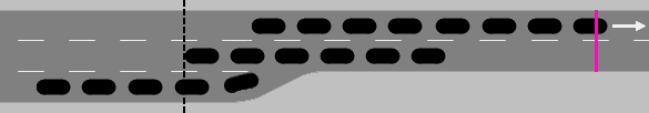 Ist die Option nicht ausgewählt, werden keine Nachbarfahrstreifen der vorhergehenden Strecke berücksichtigt, um das Stauende zu ermitteln. In der Abbildung zeigt die gestrichelte Linie die Position des Stauendes an: