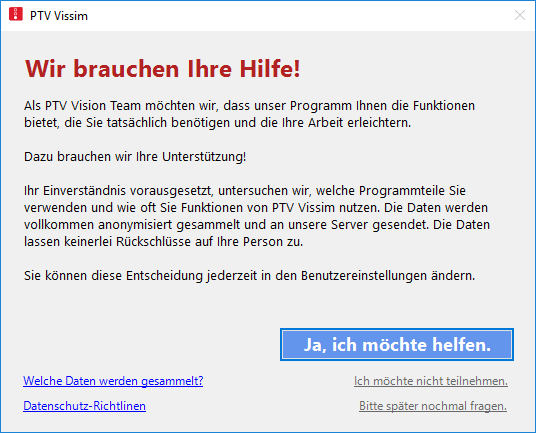 Beim dritten Start von Vissim öffnet sich das Fenster PTV Vissim – Wir brauchen Ihre Hilfe!.