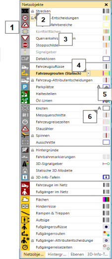 Die Netzobjektleiste enthält eine Liste mit den Netzobjekttypen. Sie können über Symbole und ein Kontextmenü Einstellungen und Funktionen für die Darstellung, Auswahl und Bearbeitung von Netzobjekten im Netzeditor aufrufen. Die Einstellungen beziehen sich immer nur auf den zuletzt aktiven Netzeditor. Wenn Sie durch Klicken in einen anderen Netzeditor diesen aktivieren, werden in der Netzobjektleiste die Einstellungen für diesen Netzeditor angezeigt.