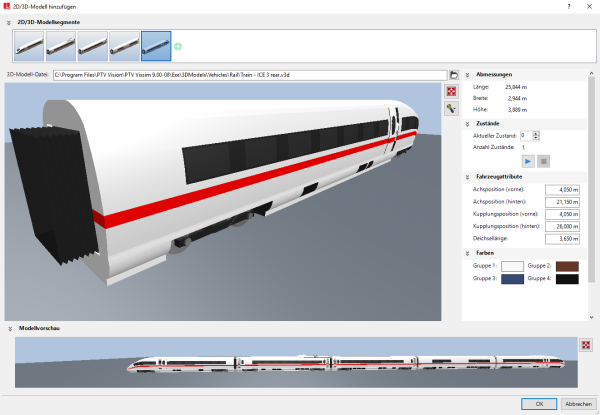Dem 2D/3D-Modell kann entweder nur ein Modellsegment mit einer 3D-Modelldatei zugeordnet sein, beispielsweise ein einzelnes Fahrzeug, oder mehrere Modellsegmente, die jeweils eine 3D-Modelldatei enthalten, beispielsweise, wenn Sie einen Zug aus einzelnen Modell-Dateien für Triebkopf und verschiedenen Eisenbahnwagen zusammensetzen. Ein 2D/3D-Modell eines Fußgängers referenziert nur das erste zugewiesene Modellsegment und dessen Modelldatei.