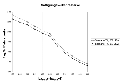 Hinweis: Die Kurven zeigen berechnete Sättigungsverkehrsstärken für Vissim-Beispiele. Für andere Verkehrsnetze ergeben sich Kurven mit anderen Werten. |