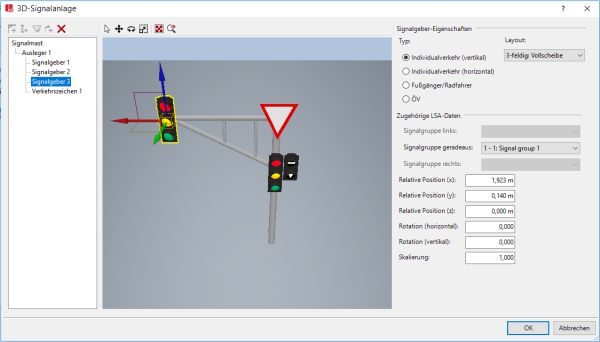 - Bereich rechts: Nur wenn im Bereich links oder in der Vorschau ein Element ausgewählt ist, werden die Attribute des Elements angezeigt (Attribute von 3D-Signalanlagen).