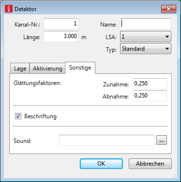 AudioDatei: Wavetable-Sound-Datei *.wav, die jedes Mal abgespielt wird, wenn ein Fahrzeug vom Detektor erfasst wird. Diese Datei muss im gleichen Verzeichnis gespeichert sein, wie die Netzdatei *.inpx. Eine Soundkarte sowie ein geeigneter Microsoft Windows-Treiber müssen installiert sein. |