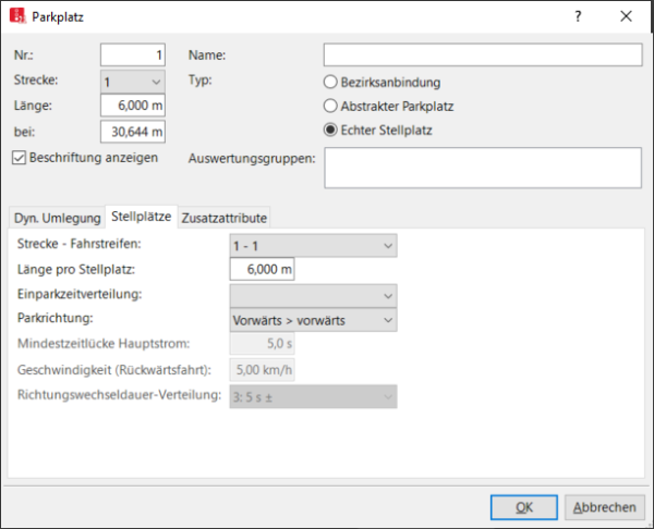 Das Fenster Parkplatz öffnet sich automatisch, wenn Sie das Netzobjekt einfügen und das automatische Öffnen des Bearbeiten-Dialogs nach Objekterstellung ausgewählt ist (Rechtsklick-Verhalten und Aktion nach Objekterstellung definieren). Standardmäßig öffnet sich nur die Liste der Parkplätze.