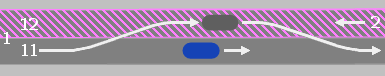 - einen Ausschnitt einer Strecke 1, die mit einem Fahrstreifen 11 und einem Überholfahrstreifen 12 ( schraffiert) bei Rechtsverkehr von links nach rechts verläuft. Vissim stellt einen Fahrstreifen schraffiert als Überholfahrstreifen dar, sobald dessen Strecke über mindestens zwei Fahrstreifen verfügt und für die Strecke das Attribut Hat Überholfahrstreifen ausgewählt ist.