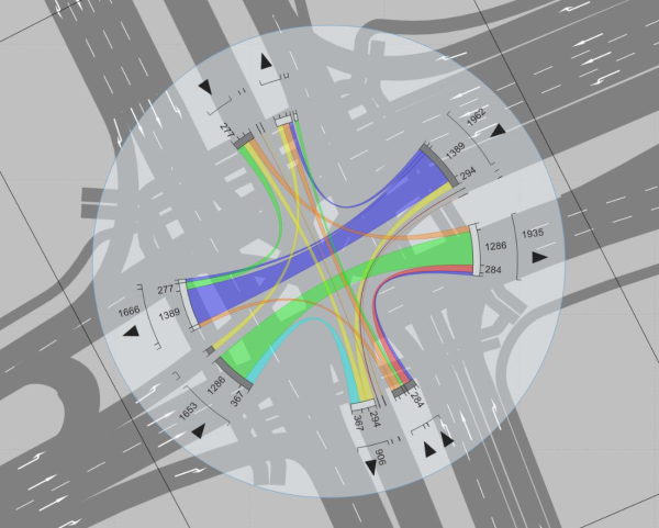 Sie können Knotenströme im 2D-Modus visualisieren. Die Knotenströme stellen die Werte von Ergebnisattributen oder benutzerdefinierten Attributen entlang der Abbiegebeziehungen in einem Knoten dar. Zudem werden Fahrbeziehungen farbig visualisiert, die Sie in der Liste Fahrbeziehungen ausgewählt haben (Attribute von Knoten). So können Sie die Daten im Netzeditor visuell miteinander vergleichen, die innerhalb eines Knotens oder innerhalb mehrerer Knoten entstehen.