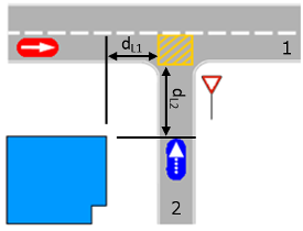 Sichtbarkeit Strecke 1, Sichtbarkeit Strecke 2: Maximale Entfernung in Meter, aus der ein sich näherndes Fahrzeug die Fahrzeuge auf der anderen Strecke wahrnehmen kann. Solange ein Fahrzeug auf einer nicht bevorrechtigten Strecke noch weit entfernt ist von der Konfliktfläche, plant es, möglichst nahe vor der Konfliktfläche anzuhalten. Vermeiden Sie Werte < 1 m, damit das Fahrzeug nicht dauerhaft stehen bleibt. In der Abbildung hat das blaue Fahrzeug unten auf Strecke 2 die Stelle erreicht, von der es volle Einsicht in das Geschehen hinter dem blauen Gebäude auf Strecke 1 und das rote Fahrzeug links hat. Damit ist die Sichtweite für Strecke 2 = dL2.