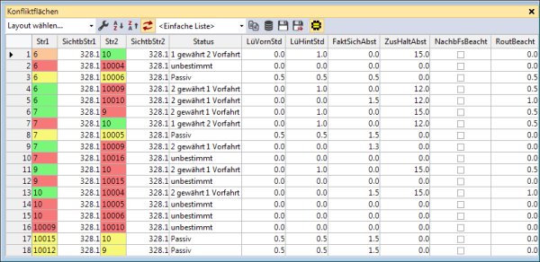 - Ein Fahrzeug des Nebenstroms befährt eine Konfliktfläche nicht, wenn es annehmen muss, dass es die Konfliktfläche nicht rechtzeitig verlassen kann, bevor ein Fahrzeug des Hauptstroms kommt. Dabei wird der Sicherheitsabstand berücksichtigt (Attribute von Konfliktflächen).