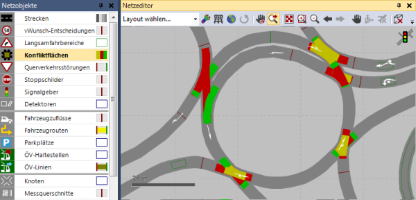 Wenn Sie in der Netzobjektleiste auf Konfliktflächen klicken, werden Konfliktflächen im Netz automatisch an der Position angezeigt, an der sich zwei Strecken oder Verbindungsstrecken überlappen. Für jede Konfliktfläche können Sie die Strecke auswählen, die Vorfahrt hat. Die Konfliktfläche kann auch passiv bleiben und damit keinen Einfluss auf die Fahrzeuge haben.