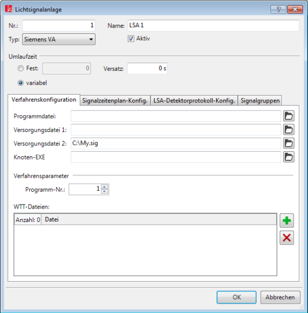 Vissim ruft im Abstand einer Sekunde für jede LSA ein eigenes Steuerungsprogramm auf. Dafür wählen Sie für jede LSA die Versorgungsdateien PW1 für die Steuerung aus.