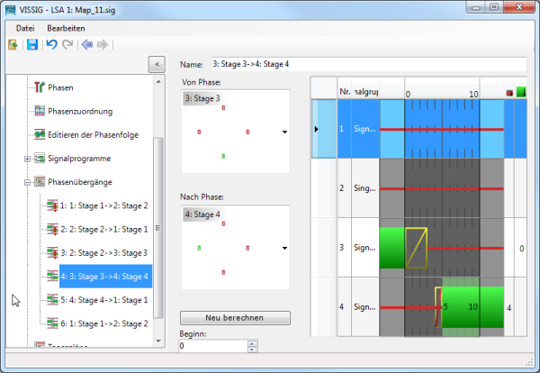 Ein phasenbasiertes Signalprogramm mit vorgegebener Umlaufdauer wird berechnet. Die Bearbeitungsansicht der Signalprogramme wird zur weiteren Bearbeitung Ihres Signalprogramms geöffnet.