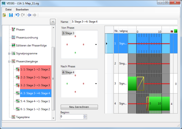 Hinweis: Wenn bei der Berechnung eines Phasenübergangs der Zustand einer Signalgruppe in der Quellphase oder der Zielphase nicht relevant ist, findet für diese Signalgruppe kein Signalwechsel statt. Innerhalb des Phasenübergangs wird der gleiche Signalisierungszustand dargestellt wie in der relevanten Phase. Wenn der Zustand einer Signalgruppe weder in der Quellphase noch in der Zielphase relevant ist, wird auch innerhalb des Phasenübergangs der Signalisierungszustand nicht relevant dargestellt. |