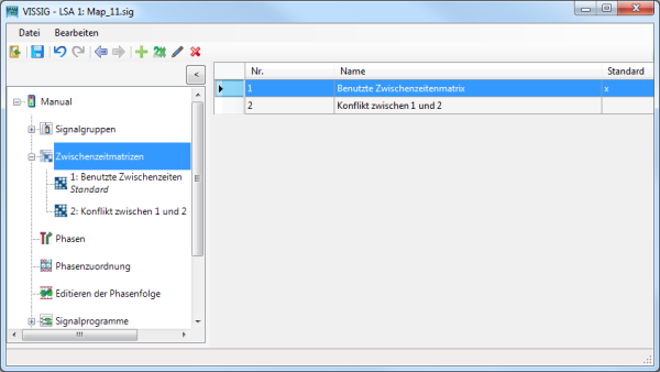 Jedem signalgruppenbasierten Signalprogramm kann individuell eine Zwischenzeitmatrix zugeordnet werden. Sie können eine Zwischenzeitmatrix im Navigator in der Phasenzuordnung als Standard auswählen (Phasenzuordnung bearbeiten). Die Zwischenzeitmatrix wird damit bei der Erstellung von Phasen, Phasenübergängen und phasenbasierten Signalprogrammen berücksichtigt.