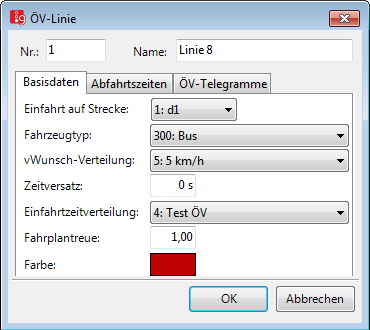 | Linie sendet ÖV-Telegramme | ÖV-Telegramme senden (ÖVTeleSend): Ist die Option ausgewählt, werden Fahrzeuge dieser ÖV-Linie von Meldepunkten erfasst. |