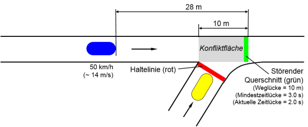 In der folgenden Abbildung fährt das blaue Fahrzeug links auf der Hauptstraße mit 50 km/h (etwa 14 m/s) und befindet sich 49 m stromaufwärts des störenden Querschnitts. Die aktuelle Zeitlücke beträgt 49 m / 14 m/s = 3.5 s. Da die Mindestzeitlücke 3.0 s beträgt, kann das gelbe Fahrzeug unten aus der Nebenstraße einbiegen: