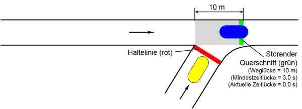 In der folgenden Abbildung hat das blaue Fahrzeug mit seiner Vorderkante den störenden Querschnitt gerade überfahren. Damit beträgt die aktuelle Zeitlücke 0 s. Das gelbe Fahrzeug muss jedoch warten, bis die Hinterkante des blauen Fahrzeugs die Konfliktfläche vollständig geräumt hat, da die Weglücke größer als 0 m ist: