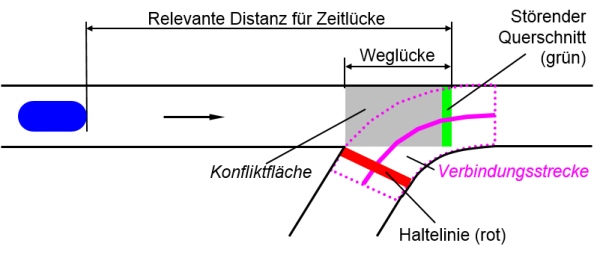 - An der Zeitlücke orientieren sich im Wesentlichen Fahrzeuge in einem wartepflichtigen Strom, die in einen bevorrechtigten Strom einfahren oder einen solchen kreuzen wollen.
