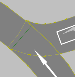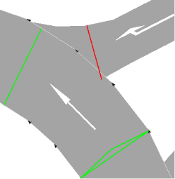 Mindestweglücke: In ausgewählten Querverkehrsstörungen zeigen grüne Dreiecke in Fahrtrichtung Mindestweglücken > 0 als Distanz vom störenden Querschnitt zum grünen Dreieck an: