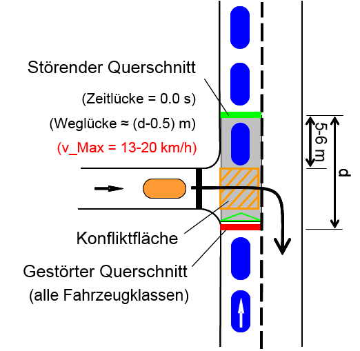 3.  Die Weglücke muss etwa die gesamte Entfernung zwischen Haltlinie und störendem Querschnitt betragen. Damit vermeiden Sie, dass Fahrzeuge die gelb markierte schraffierte Konfliktfläche befahren, solange sich dort noch ein anderes Fahrzeug befindet.
