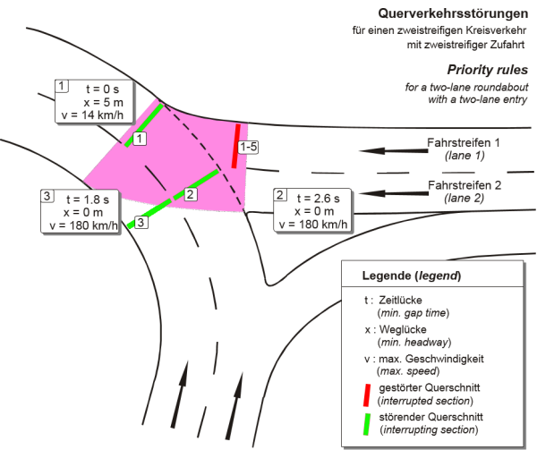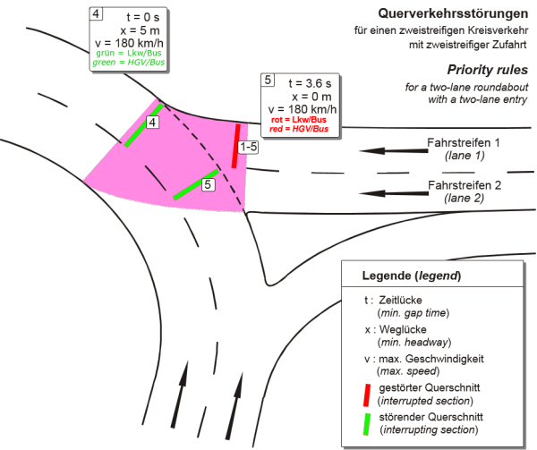 Da einfahrende Fahrzeuge auf Fahrstreifen 1 auch durch Verkehr auf der inneren Kreisfahrbahn beeinträchtigt werden, wird zusätzlich noch eine Querverkehrsstörung mit kleiner Zeitlücke für die innere Kreisfahrbahn (Nr. 3) benötigt, ebenfalls gültig für alle Fahrzeugklassen.