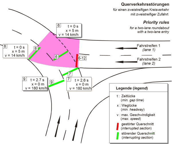 Wie schon beim rechten Fahrstreifen erfolgt zunächst die allgemeine Absicherung für alle Fahrzeugklassen mit Hilfe der Zeitlücke und der Weglücke. Da in diesem Fall jedoch zwei Fahrstreifen zu beachten sind, müssen entsprechend vier Paare von Querverkehrsstörungen angelegt werden: Nr. 6 und 7 für die äußere und Nr. 8 und 9 für die innere Kreisfahrbahn. Alle 4 störenden Querschnitte gehören zu demselben gestörten Querschnitt.