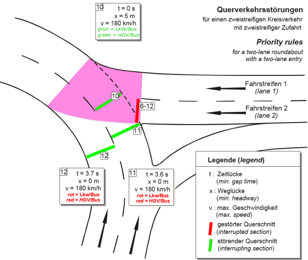 Abschließend folgen die Querverkehrsstörungen für spezielle Fahrzeugklassen: Wie bereits für Fahrstreifen 1 müssen zunächst lange Fahrzeuge besonders abgesichert werden: Nr. 10 wird zusätzlich eingefügt für denselben gestörten Querschnitt wie Nr. 6-9. Die einfahrenden Lkw und Busse Nr. 11 und 12 werden separat eingefügt für einen weiteren gestörten Querschnitt. Auch hier gelten für die innere Kreisfahrbahn geringfügig höhere Werte für die Zeitlücke.