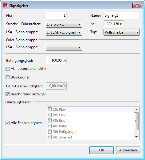 Fzklassen: Fahrzeugklassen, für die der Signalgeber gültig ist. Beispielsweise können Sie damit auf einer Strecke ein separates Signal für Busse definieren, das vom Individualverkehr ignoriert werden soll. Die Option Alle Fahrzeugtypen steht für eine virtuelle Fahrzeugklasse, die automatisch auch alle neuen Fahrzeugtypen umfasst und damit auch Fahrzeugtypen, die bisher keiner Fahrzeugklasse angehören. |