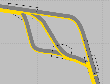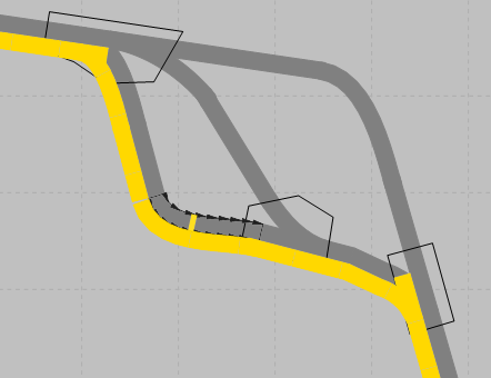 Die Abbildung zeigt den Ausschnitt eines Vissim-Netzes, in dem die Belastung an Wegen als Spinne visualisiert ist. Unterhalb des Knotens unten rechts ist der gelbe Filter-Querschnitt der Spinne platziert und ausgewählt. Die Belastungen der Wege, in denen die Strecke liegt, werden parallel als gelbe Spinnenbalken visualisiert. Die Breite variiert abhängig vom Wert der Belastung auf den Wegen: