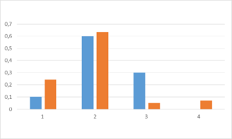 Wenn im Beispiel der letzte abgeschlossene Simulationslauf der vierte Simulationslauf dieser Umlegung war, muss dem Umverteilungsalgorithmus folgend ein Viertel der Gesamtbelastung für die Quelle-Ziel-Beziehung umverteilt werden. Die neuen relativen Sollbelastungen ergeben sich, indem zu den Werten aus der ersten Abbildung Relative Sollbelastung vorangegangener Simulationsläufe oben ein Viertel der Werte aus der Abbildung Umverteilung oben hinzu addiert wird. Die folgende Abbildung zeigt die neuen relativen Sollbelastungen. Die relative Sollbelastung von Weg 3 hat stark abgenommen, während die von Weg 1 stark zugenommen hat. Auch Weg 4 ist jetzt belastet. Dagegen ist die relative Sollbelastung von Weg 2 annähernd unverändert geblieben.