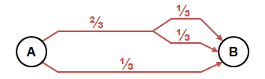 Für jede Quelle-Ziel-Beziehung wird die gesamte Verkehrsnachfrage auf alle verfügbaren Wege verteilt. Die Verteilung orientiert sich dabei an den generalisierten Kosten der Wege, die aus den gemessenen Größen und den eingestellten Gewichtungskoeffizienten berechnet werden. Ein Weg besteht aus einer Abfolge von Kanten. Zwei Wege sind verschieden, wenn ihre Folge von Kanten nicht genau übereinstimmt. Dies gilt auch, wenn sich die Wege nur in einem kleinen Teilstück unterscheiden. In so einem Fall hätten bei der Verteilung der Verkehrsmenge beide Wege ungefähr das gleiche Gewicht. Dies würde insgesamt zu einer verzerrten Verteilung führen. Dieses Problem taucht bei allen Umlegungsaufgaben auf und wird mit Roter-Bus-Blauer-Bus-Paradoxon bezeichnet. Dies zeigen die folgenden Abbildungen: