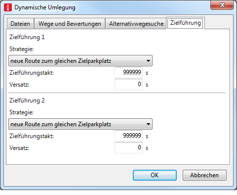 Standardmäßig wählen Fahrzeuge in der dynamischen Umlegung den Weg zu ihren Zielparkplätzen im Moment der Abfahrt vom Quellparkplatz. Dabei basiert die Wegewahl auf den generalisierten Kosten aus den vorangegangenen Simulationsiterationen (Verfahren der Wegewahl mit oder ohne Wegesuche). Bei der Zielführung basiert die Wegewahl auf der aktuellen Verkehrssituation in der laufenden Iteration. Dabei wird die Reisezeit vom letzten abgeschlossenen Zeitintervall verwendet.