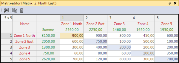 Der Matrixeditor öffnet sich. Die Matrix, die Namen der Bezirke (rot) und die Summe (grün) der Fahrten zwischen den Bezirken werden angezeigt.
