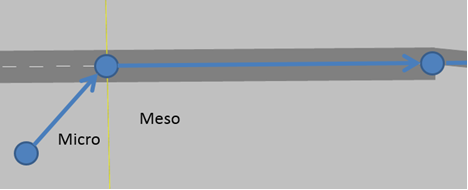 An der Übergangsstelle von Meso zu Mikro erfolgt das Einsetzen der Fahrzeuge ähnlich wie bei Fahrzeugzuflüssen. Auch hier müssen Sie sicherstellen, dass Signalgeber, vWunsch-Entscheidungen, Langsamfahrbereiche u.Ä. nicht zu nah an der Übergangstelle liegen, da sie sonst unter Umständen von den Fahrzeugen ignoriert werden.